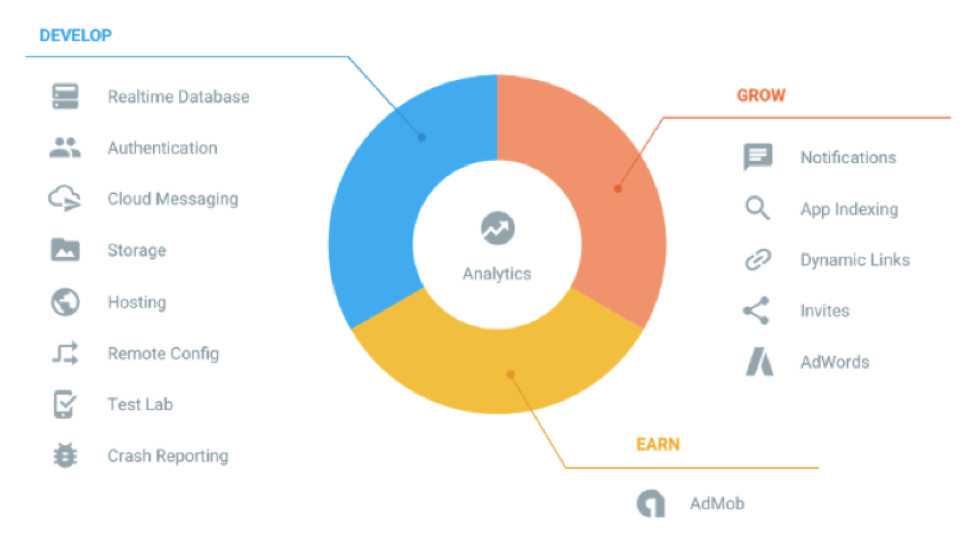 Google’s Firebase is a mobile platform that lets you develop mobile apps. It is especially geared towards business apps, with the intention of helping businesses grow their user bases and increase their profits through their mobile apps. The screenshot from Google Firebase below shows just some of the features that are a part of Firebase, again, with the intention of developing, growing and earning: