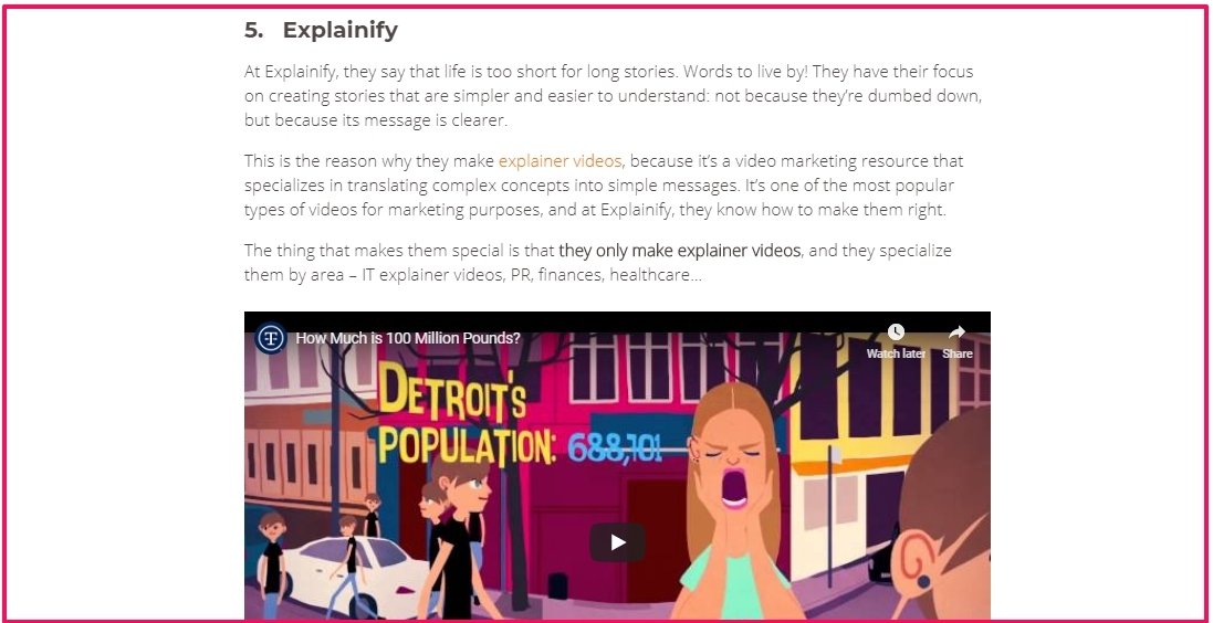 They could have simply listed each company, but they chose to embed one video for every subheading, which drastically improved the readability of the content and the average time on page.