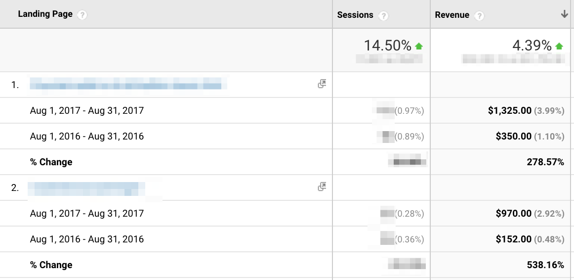 Say you want to find the top three organic landing pages by largest revenue growth year over year to identify what is contributing to your organic revenue growth. Take these steps:
