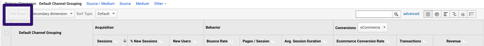 - Plotting rows keeps the total sessions on the chart instead of creating a new chart with only the data selected. Sometimes selecting a specific dimension value offers much better visuals than the Plot Rows feature